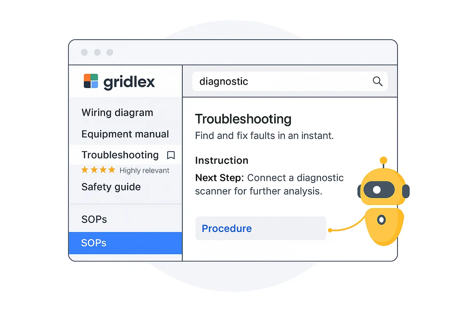 Gridlex turns your scanned PDFs and equipment manuals into a smart, searchable assistant. From oil specs to fault codes, it helps your team find exactly what they need—fast.
